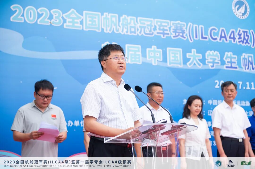 7月14日,2023年全国帆船冠军赛(ILCA4级)暨第一届学生青年运动会ILCA4级预赛、首届中国大学生帆船联赛(北方赛区)开幕式在大连市星海湾游艇码头举行,参赛选手共计约150人。中国帆船帆板运动协会主席张小冬宣布赛事开幕。
