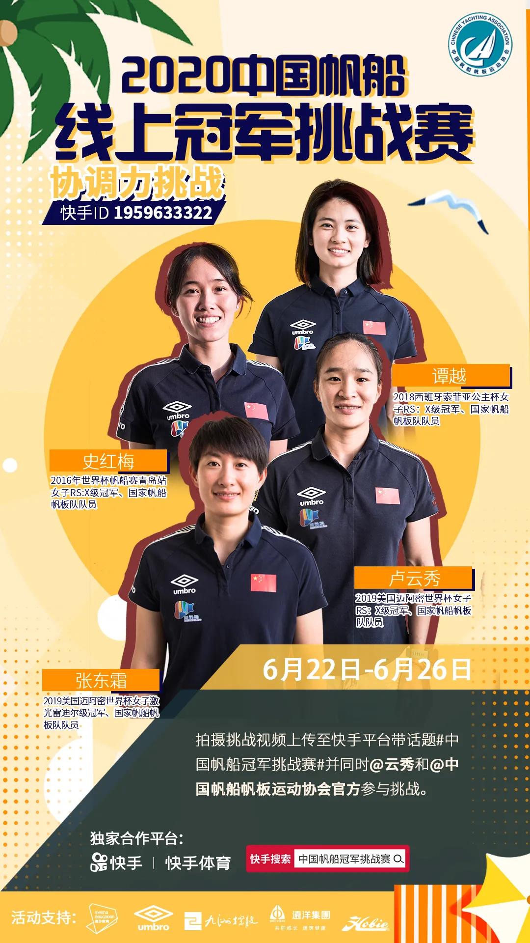 2.拍摄挑战视频上传至快手平台带话题#中国帆船冠军挑战赛#并同时@云秀和@中国帆船帆板运动协会官方参与挑战,同时备注姓名或昵称;
