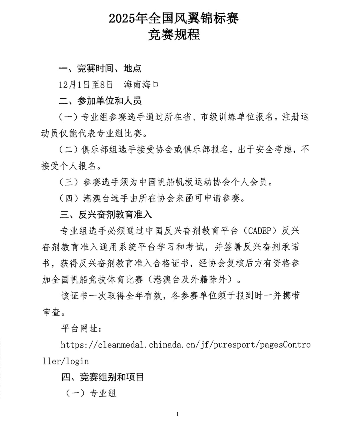 2025年全国风翼锦标赛将于12月1日-8日在海南海口举行。为保证比赛的顺利进行,现发布竞赛规程,请各参赛单位遵照执行。