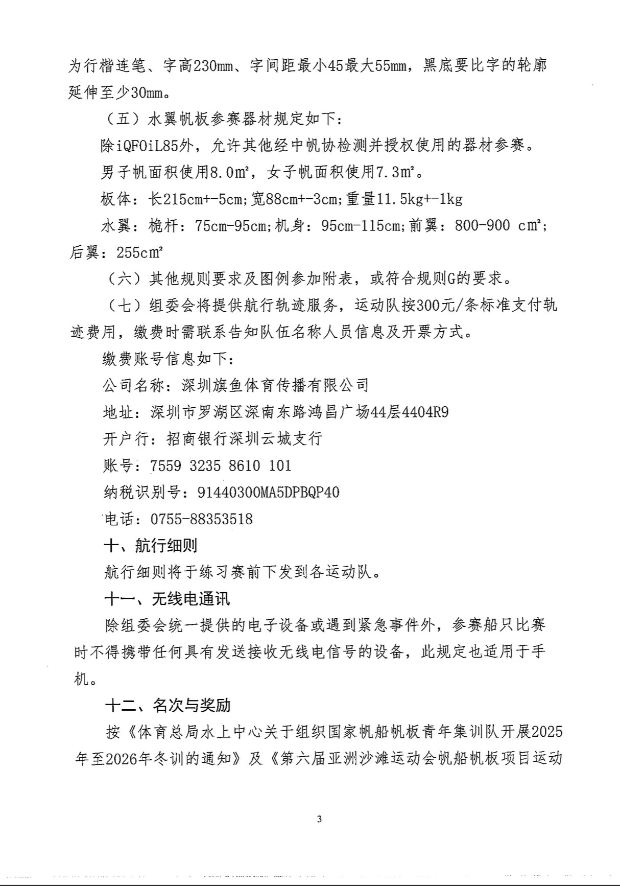 根据《体育总局水上中心关于组织国家帆船帆板青年集训队开展2025年至2026年冬训的通知》及《第六届亚洲沙滩运动会帆船帆板项目运动员选拔办法》要求,将于2025年11月25日-30日举办第六届亚洲沙滩运动会及国家青年帆船帆板集训队选拔赛,于12月8-13日举办第六届亚洲沙滩运动会OP级帆船选拔赛。