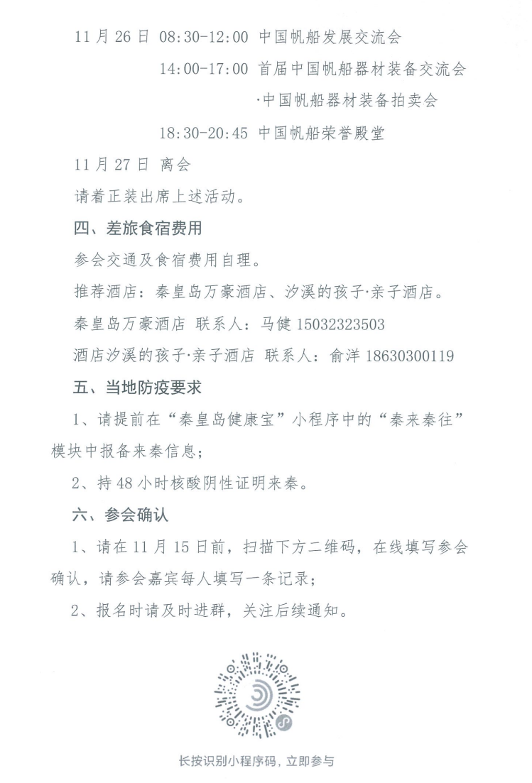 根据中帆协工作计划,将于2022年11月24日-27日在秦皇岛北戴河新区远洋蔚蓝海岸举行中帆协换届大会暨2022中国帆船年度盛典系列活动,具体安排如下: